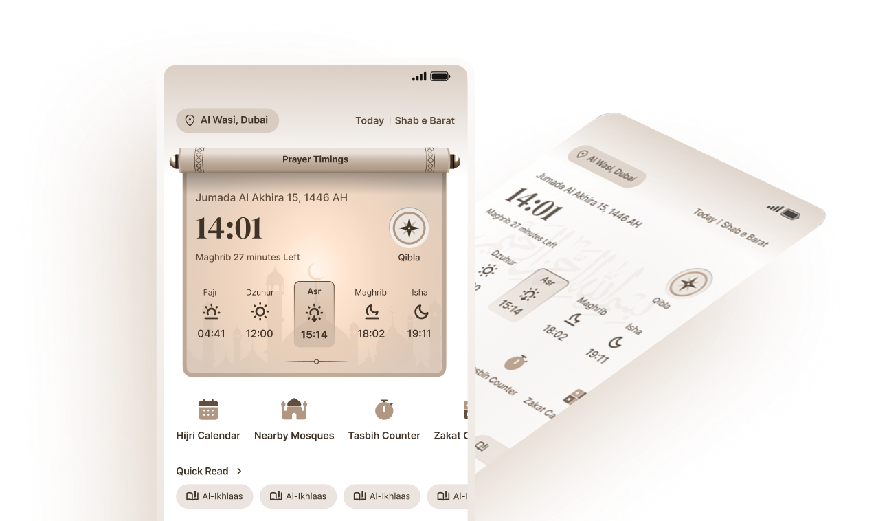 Find the exact Qibla direction using a precise digital compass or immersive AR mode. Point your phone’s camera to see real-time Qibla alignment, ensuring accurate and confident prayer anywhere you go.